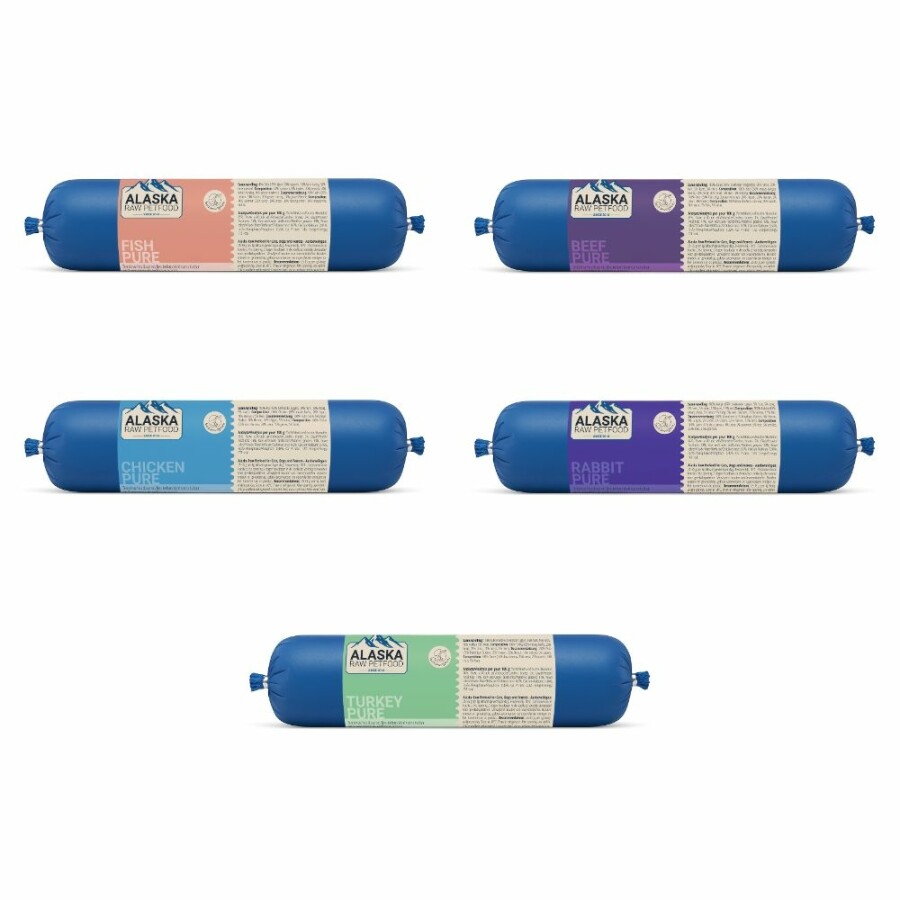 Alaska cat combidoos van 5 kg. De combi bestaat uit: 4 x 250 g Kip, 4 x 250 g Kalkoen, 4 x 250 g Konijn, 4 x 250 g Vis en 4 x 250 g Rund.