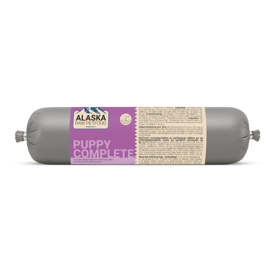 Een complete variant met verschillende diersoorten. Alaska Puppy Complete bevat spiervlees, bot en organen van kip, rund, paard, zalm, lam en konijn. Ook bevat het een groentemix met wortel, spinazie en bloemkool.