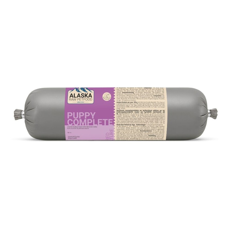 Een complete variant met verschillende diersoorten. Alaska Puppy Complete bevat spiervlees, bot en organen van kip, rund, paard, zalm, lam en konijn. Ook bevat het een groentemix met wortel, spinazie en bloemkool.