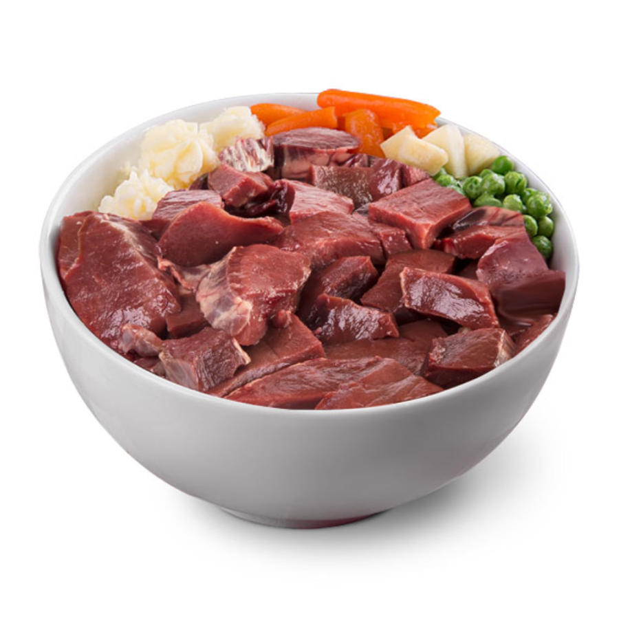 Samenstelling: 85% paard, 7% gestoomde aardappelen, 4% groenten, 2% appel, 1% mineralen en vitamines en 1% maisolie.